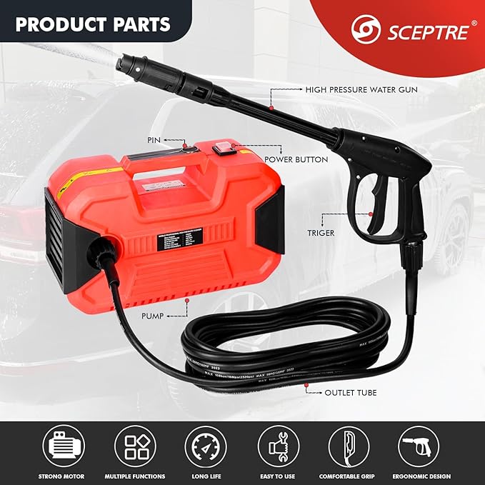 1500W Cordless High Pressure Washer - Max 180 Bar, 400L/H Flow Rate, 7M Pipe, Water Gun, Ideal for Car, Bike, & Home Cleaning (Red) Pack of 1